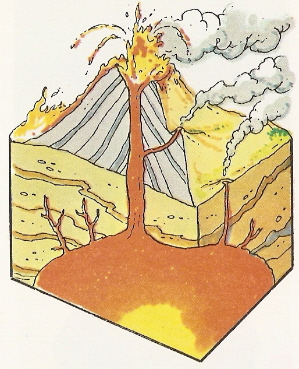 - Las rocas magmáticas o volcánicas se forman por el enfriamiento del magma (líquido del interior de la Tierra) debido a la actividad de los volcanes. En el dibujo superior izquierda observamos un volcán y cómo el magma sale al exterior en forma de lava. Ejemplos: granito y piedra pómez.