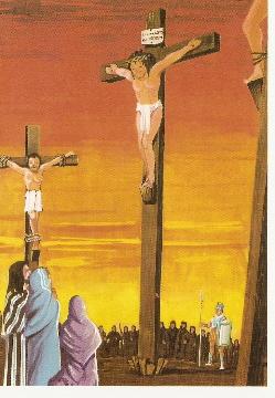 1. Pasión y Muerte de Jesús Después de la Última Cena, Jesús fue a hacer oración al Huerto de los Olivos. Decía: "Padre, si es posible, que pase de mí este cáliz, pero no se haga como yo quiero, sino como quieras Tú." (Mt 26,39). Vinieron hombres con espadas y palos y lo detuvieron. Los judíos lo interrogaron y juzgaron injustamente. Los soldados romanos le dieron fuertes latigazos, le pusieron una corona de espinas, le pegaron bofetadas y le escupieron en la cara. Poncio Pilato comprendió que era inocente y quería liberarlo, pero la gente gritaba ¡crucifícalo! y se lo entregó para que lo crucificaran, portándose como un cobarde . Jesús cargó con la cruz hasta el monte Calvario y allí lo crucificaron entre dos ladrones. Al pie de la cruz estaban María, su Madre, el Apóstol Juan y otras mujeres. Llegado el mediodía, el cielo se oscureció y Jesús dando un fuerte grito dijo: "Padre, en tus manos encomiendo mi espíritu." (Lc 23,46). E inclinando la cabeza, Jesús murió. Al ver esto un centurión romano dijo: "Verdaderamente Éste era Hijo de Dios." (Mt 27,54) |