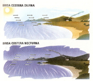 - Periodic winds: they blow at certain times of year. For Example: the summer monsoon blows from sea to land in Southeast Asia, while the winter monsoon blows from land to sea. The diurnal sea breeze blows from sea to land and the night sea breeze blows from land to sea. (See the picture)