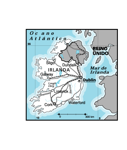 Land surface: 70,270 Km2 Currency: Euro GDP per capita: US$ 38,505 Language: Irish and English Official name: Poblacht na h’Éireann. Capital: Dublin 1,122,800 inhabitants (including city and county) (2002). Other cities (inhabitants): Cork 123,100; Limerick 54,000; Galway 65,800; Waterford 44,600 (2002) Religion (2002): Catholics 88.4%; Church of Ireland 2.9%; Presbyterians 0.5%. Geography. The northern part of Ireland is part of the United Kingdom. The Irish Republic occupies the rest of the island. The southern part of the country has massif mountain ranges, which do not surpass the thousand meters. The central plain extends from east to west and has many lakes and rivers. With a humid oceanic climate and an infertile soil, pastures apt for livestock cover a big part of the country. Agriculture mainly develops on the eastern slopes and valleys of the Shannon River. The principal agricultural products are wheat, barley, potatoes, beets and hay. The industry of transforming livestock products is the most important one. |