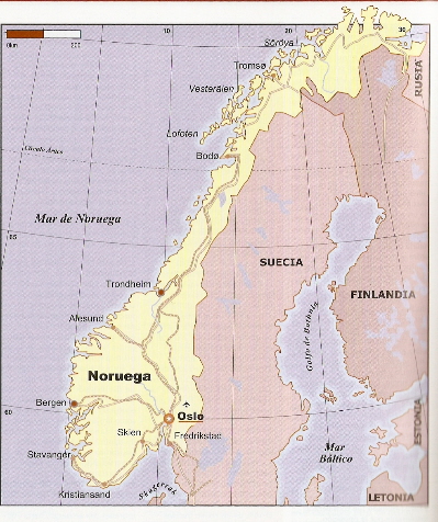 Population: 4,727,260 inhabitants Land surface: 323,802 km2 Currency: Norwegian Krone GDP per capita: US$ 41,420 Language: Norwegian Official name: Kongeriket Norge. Capital: Oslo 795,000 inhabitants (2003). Other cities: Bergen 200,200 inhabitants; Trondheim 140,700; Stavanger 109,900 (2000). Government: Parliamentary Constitutional Monarchy Religion: Church of Norway (Lutheran) 88%; There are Muslim, Catholic and Evangelist minorities. Geography. The Scandinavian mountains run throughout the Norwegian territory from north to south along the coast. On the western slope glacial erosion dug the valleys deeply below the current sea level, giving rise to the 'fjords' coast, narrow and deep sea branches framed by steep slopes. Under the influence of the oceanic drift from the north of the Gulf Stream, there are humid and pleasant winters, and cold summers, while the vast areas of the high lands have peatlands and tundra. The north is traversed by small groups of nomadic reindeer breeders, Sami. The population is concentrated in the south, especially in the region of Oslo. Nine tenths of the territory is uninhabited.