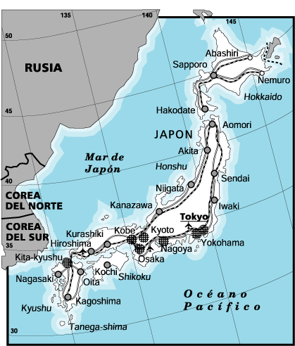 | Population: 127,937,999 inhabitants Land surface: 377,910 km2 Currency: Yen GDP per capita: US$ 31,267 Language: Japanese Religion: Buddhism and Shintoism 84%. Official name: Nihon. Capital: Tokyo 34,997,000 inhabitants (2003). Other cities (inhabitants – 2000): Yokohama 3,518,000; Osaka 2,641,000; Nagoya 2,243,400; Kyoto 1,488,800. Government: parliamentary constitutional monarchy. Geography. The Japanese archipelago consists of 3,400 islands, of which Hokkaido, Kyushu and Handoikoku are the most important. The terrain is mountainous and volcanic, dominated by the so-called Japanese Alps. As 85% of the land is made up of steep and uninhabitable mountains, 40% of the population is concentrated in only 1% of the territory in the narrow plains of the Pacific coast. There, the population densities are always higher than 1,000 inhabitants/km2. The climate is subtropical in the south, temperate in the center and cold in the north. Located at the meeting point of two marine currents (one hot and one cold), the seas of Japan are conducive to fishing, which represents one of the pillars of its economy. Intensive and mechanized agriculture is practiced in the coastal plains and the main crops are rice, soybeans and legumes. Excessive use of fishery and agricultural resources is leading to their extinction. The mineral resources available are limited. The country, which is highly industrialized, has a large foreign trade activity. It exports manufactured goods and imports large amounts of raw materials. |