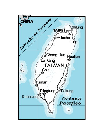 | Population: 22,370,000 inhabitants Land surface: 35,980 km2 Currency: Taiwanese Dollar GDP per capita: US$ 24,650 Language: Chinese (Mandarin) Official name: Republic of China (Taiwan, capital Taepei) Capital: Taipei (T’aipei) 2,478,000 inhabitants (2003) Other cities (inhabitants – 2000): Kaohsiung 2,478,600; Taichung 2,070,300; Tainan 770,100 (2000). Government: presidential Religion: more than half of the population is Buddhist, in its Chinese version; almost 25% are Taoist and there are also small minorities of Muslims and Christians; in some areas remain indigenous cults. Geography. Taiwan is located 160 km southeast of continental China. It is integrated within a chain of volcanic islands of the west of the Pacific, which also integrates the islands of Japan. Mountains stretching from north to south occupy the central part of the island. The main agricultural region of the country is a narrow plain on the west coast, where rice, sugar cane, bananas and tobacco are grown. Forests cover more than two thirds of the island. It has some mineral resources: coal, natural gas, marble, limestone and some amounts of copper, gold and oil. |