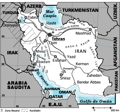 Superficie terrestre: 1.648.200 Km2 Moneda: Rial iraní PIB: 7.968 $ per cápita Idioma: Persa Nombre oficial: Dshumhurije Islâmije Irân. Capital: Teherán 7.190.000 hab. (2003). Otras ciudades: Mashhad 2.020.400 hab.; Isfahan 2.535.000; Tabriz 1.207.600 (2000). Gobierno: república presidencialista Religión: musulmanes chiítas 89%; musulmanes sunnitas 10%; bahai, cristianos, zoroástricos y judíos 1%. Geografía. Este extenso país de un millón y medio de kilómetros cuadrados está ocupado por una meseta esteparia, de clima riguroso, rodeado de montañas (Zagros en la frontera occidental, Elburz en el norte) y desiertos. En los oasis, regados por aguas subterráneas se cultivan cereales y frutas. Las costas del Mar Caspio son propicias para cultivos tropicales y subtropicales (algodón, caña de azúcar y arroz). Las industrias modernas (petroquímica, textil, construcción) han crecido pero la fabricación artesanal de alfombras y otros tejidos continúa siendo importante. |