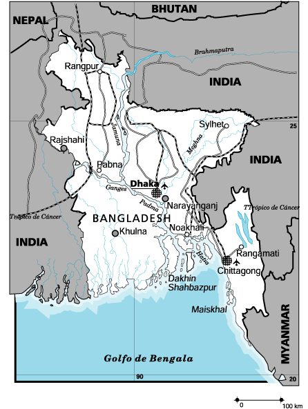 Superficie terrestre: 144.000 Km2 Moneda: Taka de Bangladesh PIB: 2.053 $ per cápita Idioma: Bengalí Nombre oficial: Gana Projatantri Bangladesh. Capital: Dhaka 11.560.000 hab. (2003). Otras ciudades: Chittagong 2. 500.900 hab.; Khulna 1.168.800; Rajshahi 687.300 (2000). Gobierno: república parlamentaria Religión: mayoritariamente islámica (83%), hindú (16%) y algunas minorías budistas, cristianas y animistas Geografía. Este país ocupa el delta del río Padma –que se forma por la confluencia del Meghna con el Ganges y el Brahmaputra– Bangladesh es una planicie de fértiles tierras aluvionales, en las que se cultiva arroz, té y yute. Hay grandes extensiones de selvas y pantanos. El clima es tropical monzónico, con abundantes lluvias en verano (entre junio y setiembre), frecuentemente acompañadas de huracanes e inundaciones de efectos catastróficos. Existen zonas y períodos de grandes sequías y ciclones esporádicos. Los niveles crecientes del mar constituyen una amenaza. |