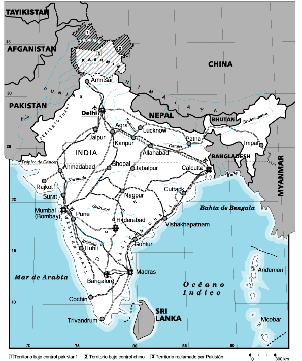 Superficie terrestre: 3.287.260 Km2 Moneda: Rupia india PIB: 3.453 $ per cápita Idioma: Hindi Nombre oficial: Bharat. Capital: Nueva Delhi 14.146.000 hab. (2003). Otras ciudades: Bombay 18.100.000 hab.; Kolkatta (Calcutta) 12.900.000; Chennai (anteriormente Madras) 7,6 millones; Hyderabad 6.300.000; Bangalore 6.200.000 (2000). Gobierno: República Federal Religión: 83% hindúes; 11% musulmanes; sikhs 2,5%; cristianos 2%; budistas 1 % y otros 0,5. Geografía. En este país distinguimos tres regiones: el Himalaya, que se extiende en la frontera norte; la llanura septentrional del Ganges, fértil y densamente poblada y la meseta del Dekán, al centro. La cordillera del Himalaya impide el paso de los vientos fríos del norte. El clima está determinado por los monzones: es cálido y seco durante ocho meses del año, y en el verano llueve copiosamente. Predomina el cultivo del arroz. Carbón y hierro son los principales recursos mineros. En la zona de Cachemira (Kashmir), al noroeste, existen importantes reservas de petróleo, en permanente litigio con Pakistán. |