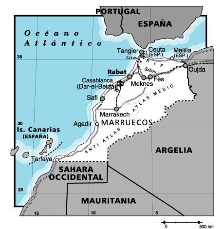 | Population: 31.605.616 inhabitants Area: 446.550 Km2 Coin: Dirham PIB: 4.555 $ per capita Language: Arabic Name official: Al Mamlaka al-Maghrebiya. Capital: Rabat 1.759.000 inhabitants (2003). Other cities: Casablanca (Dar-el-Beida) 3.292.100 inhabitants; Fez 900.900; Marrakech 736.500 (2000). Government: Monarchy Religion: the majority of Moroccan are Muslims, mostly Sumnis (98,7%); Christians (1,1%); Jews (0,2%). Geography. Morocco is opened to oceanic influences due to its wide coast of 800 km. Berbers nomads lived in East Morocco, a mountainous (mountain ranges of Atlas and Rif) poor steppe. At the foot of the mountains there are plains where citrics, pulse and grain grow. In the West areas, at the rugged regions of Atlas Upper-Atlas and Anti-Atlas mountains, are extensive livestock farming and is rich in phosphates, zinc and lead mines. In the coastal plains vineyard and citrics are cultivated. Fish stocks are very important, and they are frequently exploited by foreign fleets. Soil erosion is due to certain factors, including farming expansion over poor areas, exploitation of fields by overgrazing, destruction of woody vegetation for firewood and conversion of forested areas in plantations. Some efforts have been taken to revert these problems, mainly by reforestation. |