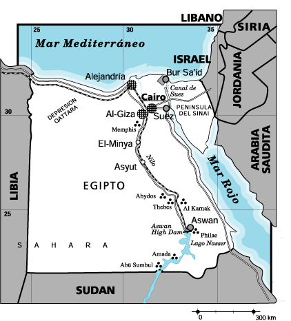 | Population: 76.840.047 inhabitants Area: 1.001.450 Km2 Coin: Egyptian pound PIB: 4.337 $ per capita Language: Arabic Official name: Jumhuriyah Misr al-'Arabiyah Capital: Cairo (Al-Qahirah) 10.834.000 inhabitants (2003). Otras cities: Alexandria (Al-Iskandariyah) 3.723.000 inhabitants; El Giza (Al-Jizah) 2.485.400; Subra al-Haymah 974.000 (2000). Government: Presidential Republic Religión: Islamic, mostly Sunni. Coptic Orthodox (10%) and other Christian churches. Geography. The 99% of the population concentrates in the Nile valley (Nahr-an-Nil), which represents 30% of its total area. The rest of the country is desertic, with isolated oasis. The rises of the Nile give shape to the country’s economy since centuries. Although controversial and cause of large scale population desplacements, the building of dams (the most popular is Assuan, at the South of the country) has benefited agriculture, specially wheat, rice and corn. In addition to traditional crops, there are also crops of cotton and sugar cane. The use of hydroelectric energy, together with the Northeast oil (from the Sinai peninsula), favoured the industrial development. |