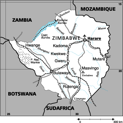 Area: 390.760 Km2 Coin: Zimbabwe dollar PIB: 2.038 $ per capita Language: English Name official: Republic of Zimbabwe. Capital: Harare (ex Salisbury) 1.600.000 inhabitants (2006). Other cities: Bulawayo 794.600 inhabitants; Chitungwiza 390.600; Mutare 168.100 (2000). Government: Presidencialist Religion: traditional African cults (55%); Christians (45%), mostly Anglicans. Geography: Zimbabwe country is a high, undulated plateau. The most important area– or High Veld–, a combination of fertile soils, favourable rainfalls and new posibilities of mining, concentrates most of the urban population. The weather is tropical, regulated by the altitude. |