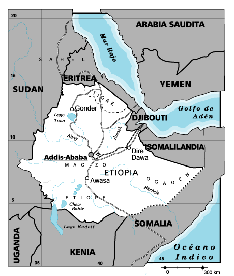 Population: 85.219.109 inhabitants Area: 1.104.300 Km2 Coin: Ehiopian birr PIB: 1.055 $ per capita Language: Amharic Name official: Federal Democratic Republic of Ethiopia Capital: Addis-Abeba 2.723.000 inhabitants (2003). Otras cities: Dire Dawa 202.700 inhabitants; Harar 93.900 (2000). Government: Federal republic Religión: The Ethiopian Orthodox Church is the most popular between Amhara and Tigray. Geography. Ethiopia is a mountainous country, without coasts, with an altitude higher than 4.000 m. It is isolated of neighbour regions due to its topography. There are three vegetation areas, disposed in terms of altitude, in the plateaus and mountains: the high plateau, which are higher than 2.500 metres, is rainy and cold. The Dega is where cereals are cultivated and cattle is herd. In the deep valleys which crossed the plateau warm rainy regions and jungles are founded: it is called the Kolla (over 1.500 m). The medium plateaus (1.500-2.500 m), with a less rainy, warm weather, are the most populated areas. There, coffee and cotton are cultivated. At East, the desertic plateau of Ogaden has a population of Somali nomad sheperds.