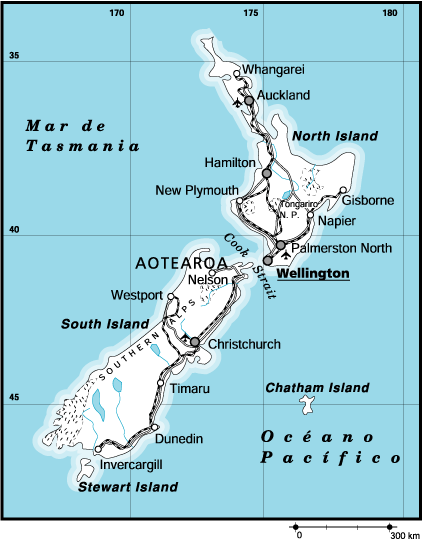 Geography:It is situated in the South-East of Australia. Its two main islands are mountainous: the North island is volcanic, with plateaus and geisers. The South is crossed by a mountain range (Southern Alps), with peaks over 3.000 metres. The climate is rainy and temperate, being colder in the South. The basis of the local economy is agriculture, but tourism is increasing importance. |