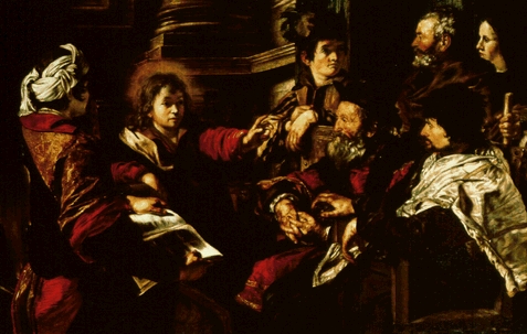 Al finalizar la primera jornada Jesús no apareció. José y María preguntaron a chicos y grandes, y nadie lo había visto por el camino; con el corazón roto de pena volvieron a Jerusalén. Lo buscaron angustiados, hasta que llegaron al templo en donde lo hallaron en una de las dependencias en las que los doctores de la ley instruían al pueblo que asistía. María y José se asomaron y allí lo vieron en medio de ellos, escuchándole y haciéndole preguntas. Todos se maravillaron de la inteligencia de sus respuestas. Se acercó María y le reprochó cariñosamente.