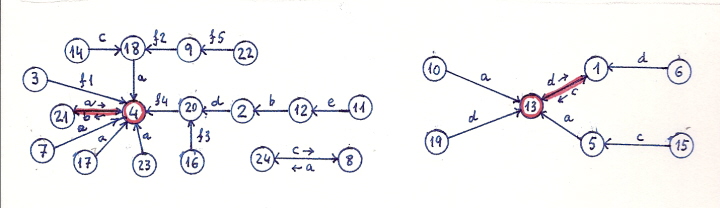 - El 4 tiene 7 elecciones con las razones a(5), f1 y f2. Tiene atracción mutua con el 21, por b.