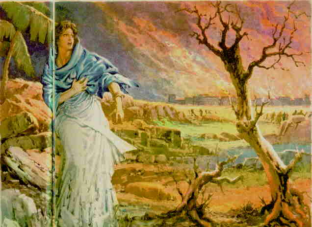 El sol salía, y empezó a caer una lluvia de azufre ardiendo sobre Sodoma y Gomorra. Las dos ciudades, con sus habitantes, quedaron arrasadas. La mujer de Lot miró atrás y quedó convertida en una estatua de sal.
